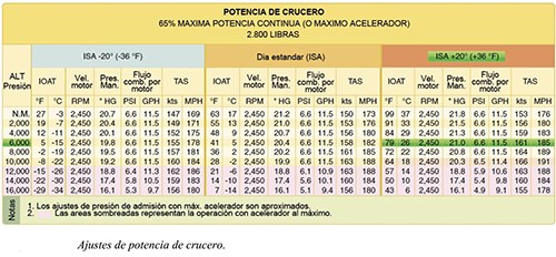 Primero, localice la altitud de presión de 6.000 pies en el lado izquierdo de la tabla. Siga esa línea hacia el extremo derecho de la tabla, bajo la columna de 20 °C (o 36 °F). A 6.000 pies, un ajuste de rpm de 2.450 mantendrá 65 por ciento de potencia continua a 21,0″Hg con un flujo de combustible de 11,5 galones por hora y velocidad de 161 nudos.