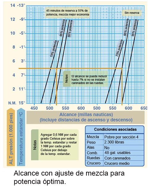 Otro tipo de gráfico de crucero es el de alcance con ajuste de mezcla para potencia óptima. Este gráfico ofrece el mejor alcance basado en la potencia y la altitud. Usando la siguiente figura, encuentre el alcance al 65 por ciento de potencia, con y sin reserva basado en las condiciones provistas.
