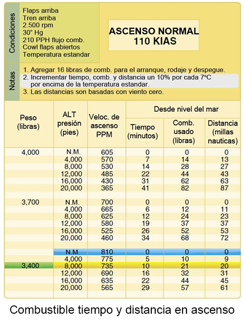 Para empezar, encuentre el peso de 3.400 en la primera columna de la tabla. Muévase por la columna de la altitud de presión para encontrar los números de altitud al nivel del mar. Al nivel del mar, los números son cero. Luego, lea la línea que corresponde con la altitud de crucero de 8.000 pies. Normalmente, un piloto resta estas dos series de números uno del otro, pero dado el hecho de que al nivel del mar los números son cero, se sabe que el tiempo para ascender desde el nivel del mar a 8.000 pies es de 10 minutos. También se sabe que se usarán 21 libras de combustible y se cubrirán 20 NM durante el ascenso. Sin embargo, la temperatura es de 22 °C, que es 7° por encima de la temperatura estándar de 15 °C. La sección de notas de la tabla indica que los resultados se deben aumentar en diez por ciento por cada 7° por encima del estándar. Multiplique los resultados por diez por ciento o 0,10 (10 x 0,10 = 1,1 + 10 = 11 minutos). Tras tener en cuenta el diez por ciento adicional, los resultados deben ser 11 minutos, 23,1 libras de combustible y 22 NM. Observe que el combustible se reporta en libras de combustible, no en galones. El combustible de aviación pesa seis libras por galón, así que 23,1 libras de combustible es igual a 3,85 galones de combustible (23,1 ÷ 6 = 3,85).