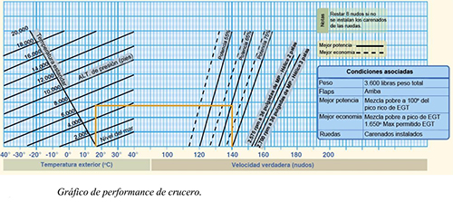 Los fabricantes producen varios gráficos diferentes para la performance de ascenso y crucero. Estos gráficos incluyen todo desde combustible, tiempo y distancia para el ascenso, hasta mejor potencia de crucero, y alcance en crucero.