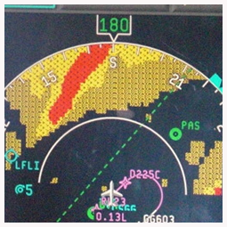 4. El radar aerotransportado es un equipo transportado por los aviones para localizar las perturbaciones meteorológicas. Los radares aerotransportados generalmente operan en las bandas C o X (alrededor de 6 GHz o 10 GHz, respectivamente) que permitan tanto la penetración en precipitación fuerte, necesaria para determinar la extensión de las tormentas, y la reflexión suficiente de precipitación menos intensa.