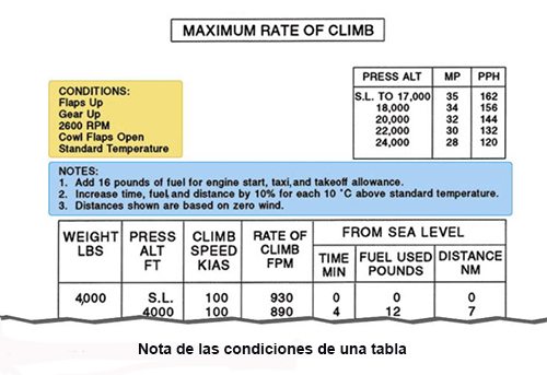 Cada gráfico se basa en ciertas condiciones y contiene notas sobre cómo adaptar la información para las condiciones de vuelo.
